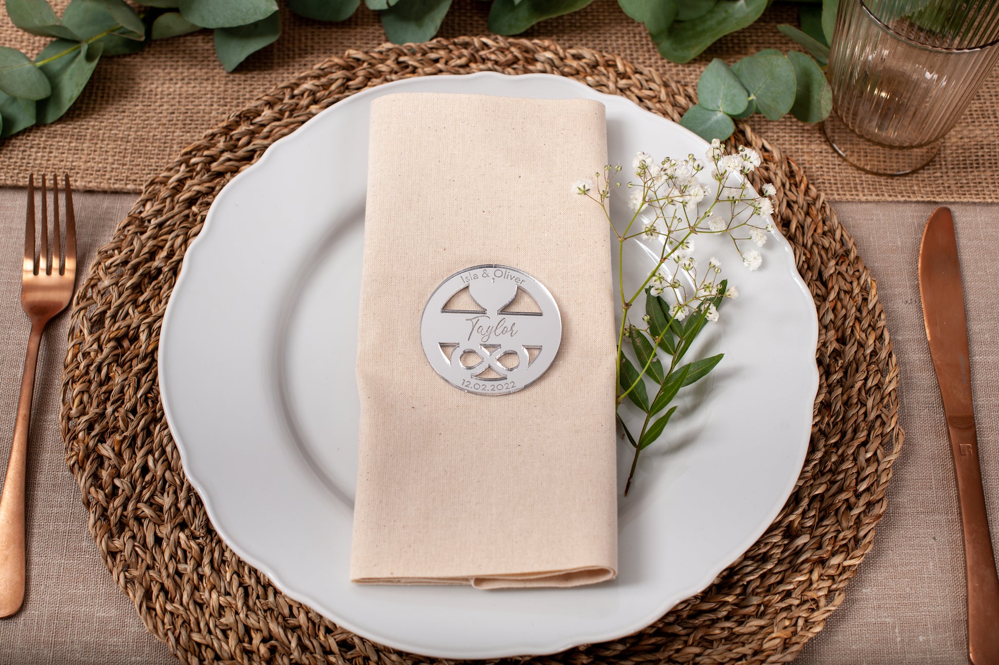 Add a meaningful and elegant touch to your table with these personalised circle place names featuring heart and infinity cut out details. Each piece is carefully laser cut and engraved with your guest’s name, creating a beautiful symbol of love and connection.