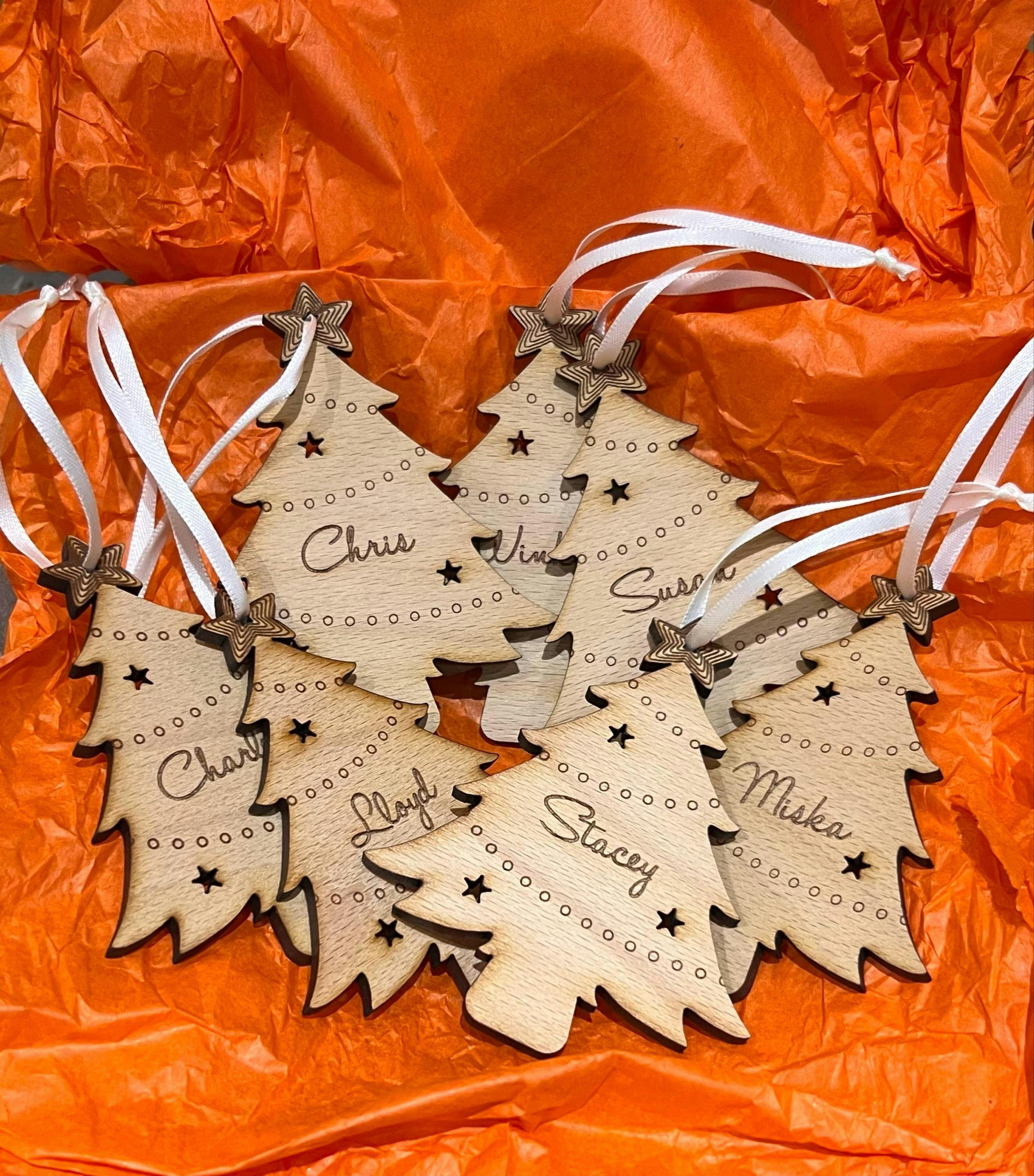 Personalised Wooden Christmas Tree Place Cards – Engraved Dinner Table Décor for Christmas Hosting